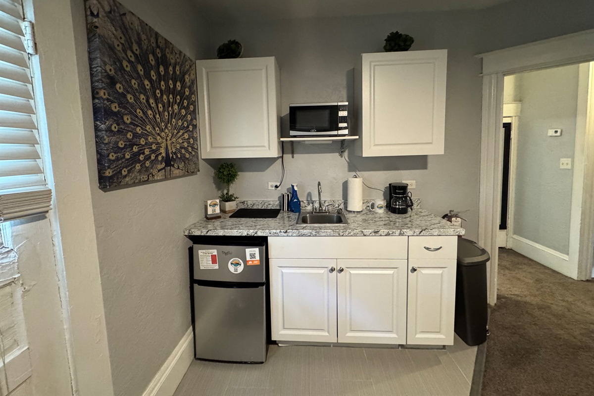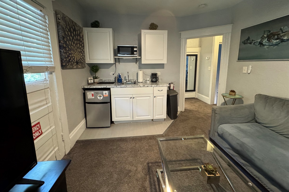 There is a kitchenette with sink, refrigerator, microwave, dishes, glasses silverware etc. (no stove). Netflix, amazon prime and a digital antenna are provided. Unit is on 2nd floor.